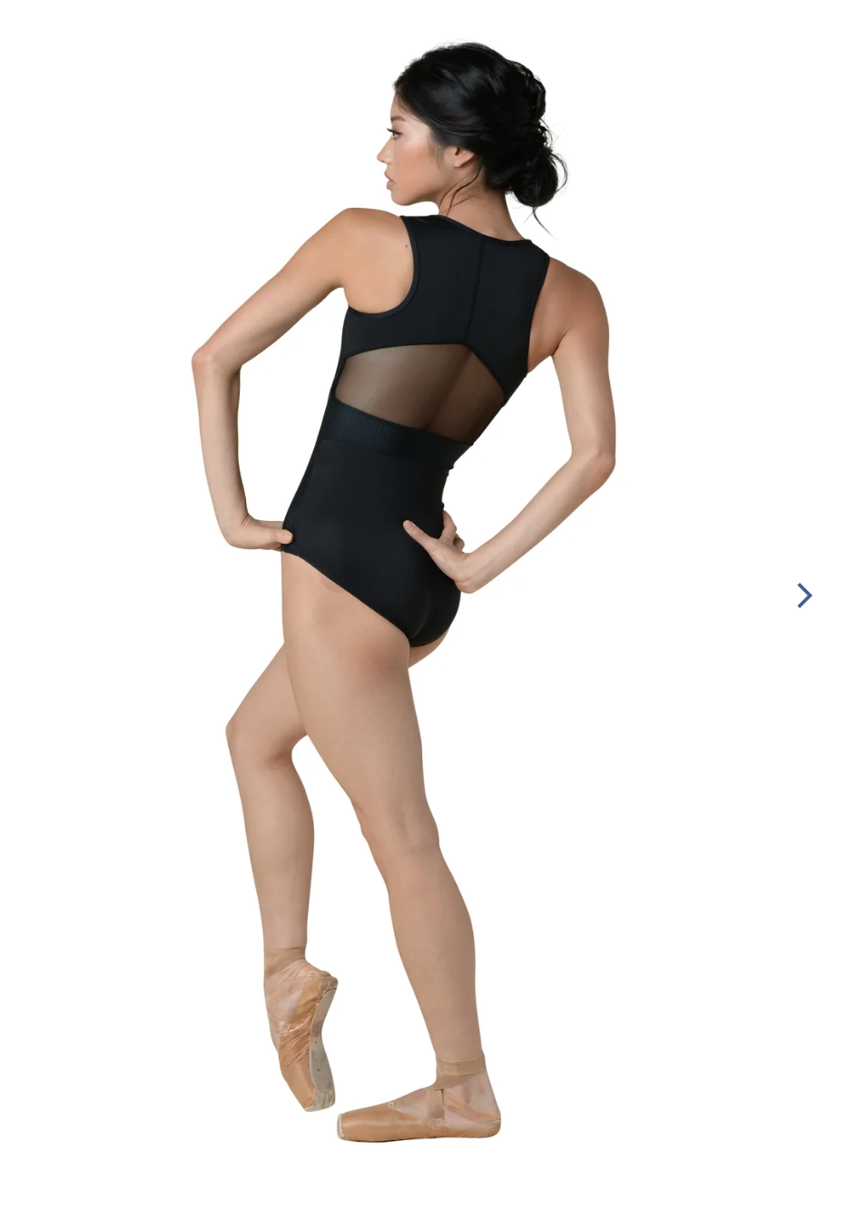Scuba style leotard with side and waist shiny rib panels, center front zipper closure and sheer mesh back insert. Shelf bra with removable cups. Made from nylon/spandex materials.