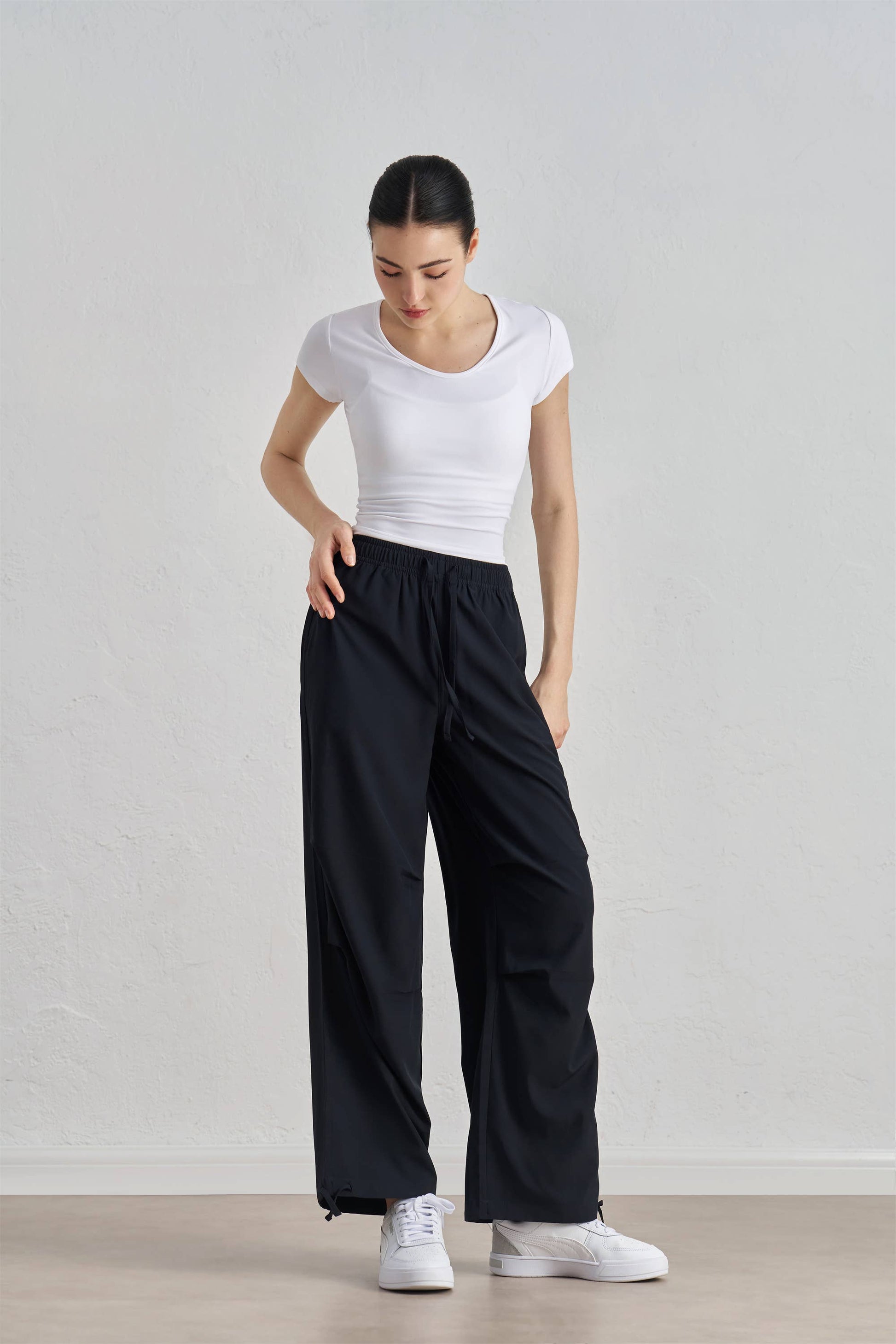 Features: Elastic waistband with adjustable drawstring, side pockets for added convenience, and elastic cuffs at the ankle for a secure fit